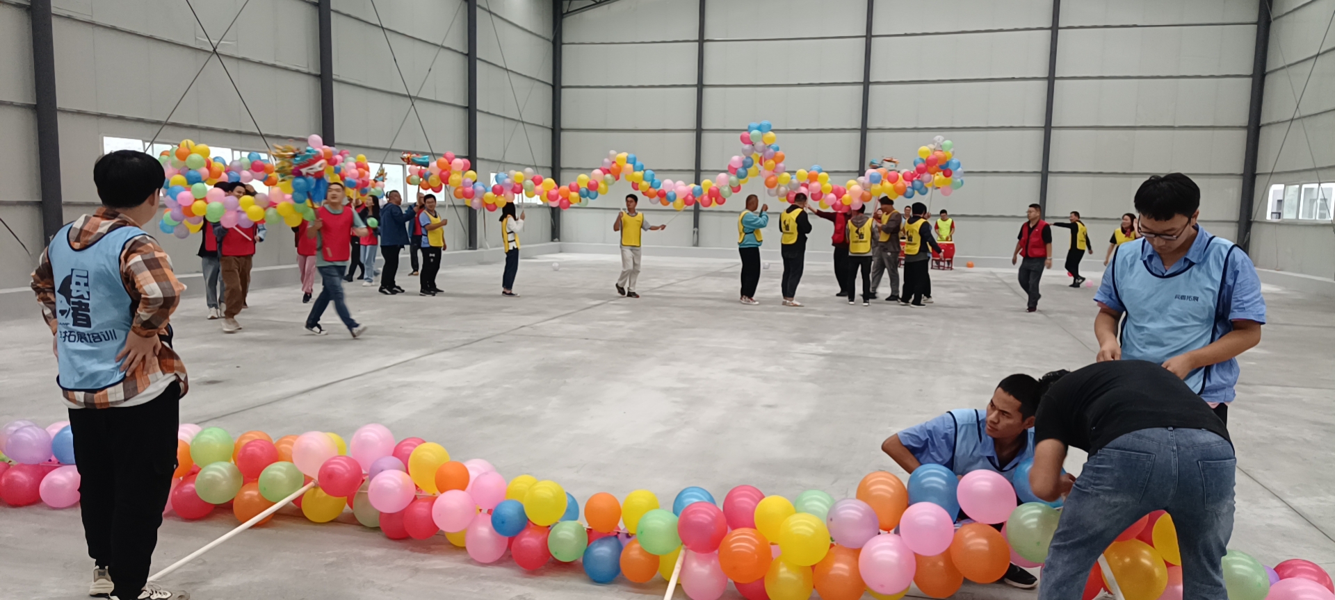 活动伊始,在教练员的指导下,我们通过“花开花落”等互动游戏开始破冰和热身。教练员一声令下,队员们开始迅速设计队名、队标、口号和队歌,有红色“朝阳队”、绿色“乘风队”、黄色“向前队、蓝色“星星队”。在“同心杆”、“抢滩登陆”、“逢7必过”等活动中,我们每支队伍、每个队员都充分发挥了团结协作、相互鼓励、相互支持的团队精神,完美地完成了各项挑战。最后,在中国传统的舞龙舟活动中,队员们分工明确,有的吹气球、有的扎龙脊......不一会儿,四条栩栩如生的巨龙诞生了,在一片锣鼓喧天、欢歌笑语中,巨龙在空中舞动,将此次团建活动推向了高潮。