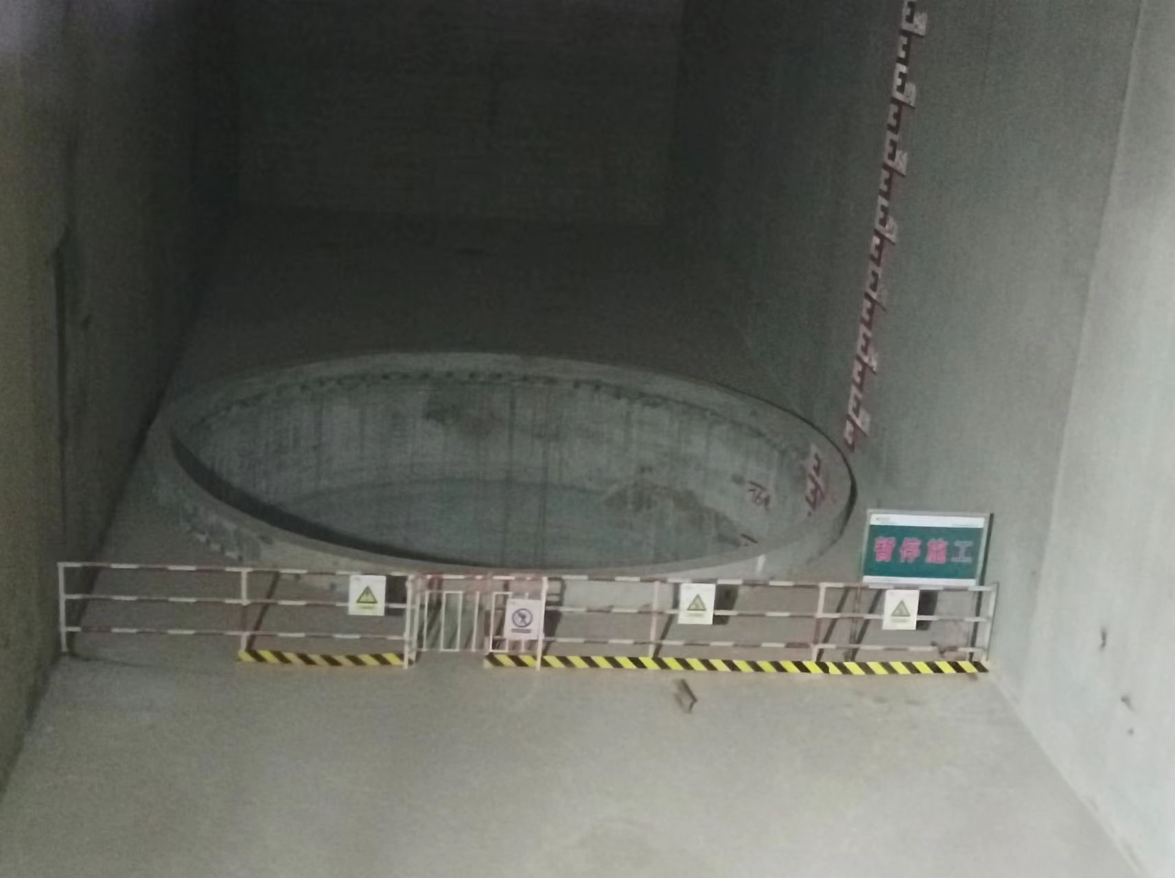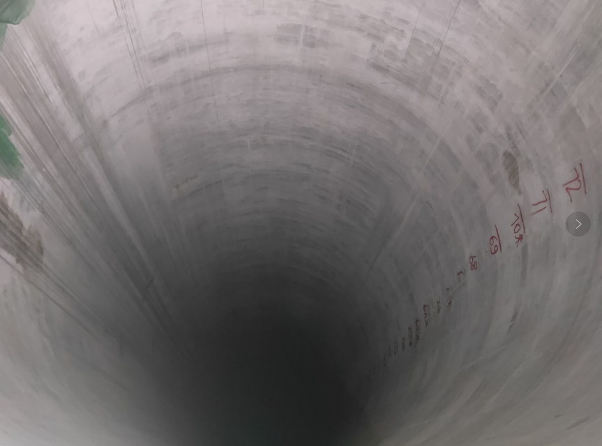 尾水调压井为圆形,总高度104.6米,分为大井、小井两个部分。大井内径10m,高80.5m,衬砌厚度0.8m;小井内径4.6m,高24.1m,衬砌厚度0.6m。3条尾水调压井于2021年5月20日正式开挖施工,2021年12月10日开始衬砌混凝土浇筑施工,累计完成钢筋制安657吨,混凝土浇筑8164立方米。